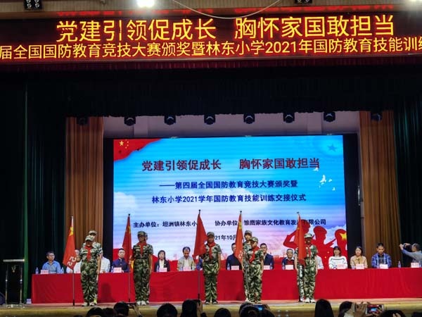 為進一步貫徹落實《中華人民共和國國防教育法》和國防特色學校相關(guān)要求,培養(yǎng)學生的國防意識,提高國防素質(zhì),深入推進學校國防特色建設,10月22日,坦洲鎮(zhèn)林東小學在體育館舉行了第四屆全國國防教育競技大賽頒獎暨林東小學2021年國防教育技能訓練交接儀式。中華網(wǎng)國防軍事發(fā)展中心總經(jīng)理、大賽組委會秘書長牛淏屹,中山市委宣傳部宣傳教育科科長康維華,中山市教育和體局體衛(wèi)藝科四級主任科員李藝,中山市中小學德育研究與指導中心副主任、石岐區(qū)教體文旅局德育專干潘志堅,坦洲鎮(zhèn)宣傳辦副主任、教體文旅局副局長張穎銘,坦洲鎮(zhèn)教體文旅局副局長楊興,鎮(zhèn)武裝部干事高華順,鎮(zhèn)團委專干黃家燕,市全民國防教育講師團成員梁華,鎮(zhèn)教體中心專干、兄弟學校校長以及林東小學五、六年級全體師生和各班家委會成員參加了此次活動。