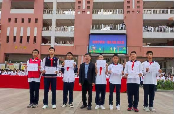 比賽結束后,吳超華主任宣布比賽結果,榮獲一等獎的班級有三個,二等獎的班級有七個,三等獎的班級有五個,其中初一15班榮獲特等獎。校領導為班級頒發(fā)榮譽獎狀并合影留念。