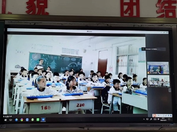 一根網(wǎng)線,一塊屏幕,將相距四百多公里的兩校師生緊緊連在一起。姚敏鳳老師的口風琴課教同學們認識口風琴、學做手指操、學習手型、認識鍵盤、學習呼吸并且學習吹奏歌曲《搖啊搖》。潘玉迪老師的《吃瓜果的人》美術(shù)課,深深吸引了大溝小學二年級的同學們,用欣賞小朋友吃瓜果的表情視頻進行課堂導(dǎo)入,通過講解知識點、微課講解繪畫步驟及教師示范教同學們畫吃瓜果的人。兩節(jié)藝術(shù)課帶給大溝小學的同學們以別開生面的體驗,孩子們興趣盎然、樂在其中。