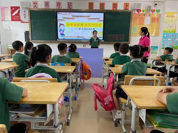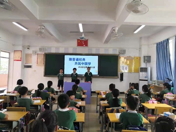 推普周里,五桂山學(xué)校一至六年級都開展了“推普誦經(jīng)典,共筑中國夢”的經(jīng)典誦讀大賽。一年級的同學(xué)童聲稚嫩,卻能瑯瑯上口誦讀著《大風(fēng)歌》 《詠鵝》 《江南》等小學(xué)生必背的75首古詩,這也得益于學(xué)校一貫重視學(xué)生中華優(yōu)秀傳統(tǒng)文化的培養(yǎng)與傳承。中高年級的同學(xué)們自信滿滿地背誦著自己喜愛的古詩。詩詞大會的舉辦,讓同學(xué)們領(lǐng)悟到了中華詩詞的獨(dú)特魅力,領(lǐng)略到華夏文化的博大精深。更明白了說好普通話的重要意義,關(guān)注了普通話的標(biāo)準(zhǔn)發(fā)音,更嚴(yán)格地要求自己說話字正腔圓,提高了語言表達(dá)的能力,更加熱愛祖國的文字。