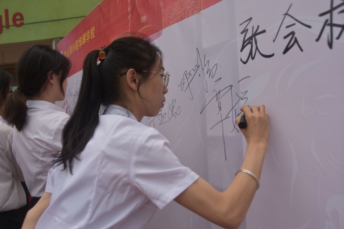在學(xué)校主要領(lǐng)導(dǎo)和初中部全體教師的帶領(lǐng)下,同學(xué)們鄭重地在宣誓橫幅上簽下了自己的名字,用實(shí)際行動(dòng)實(shí)踐著許下的諾言。