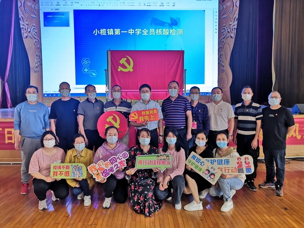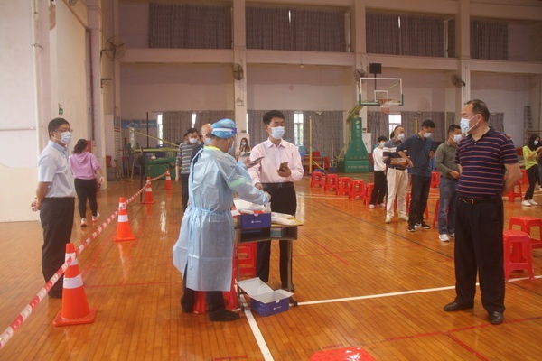 為保障核酸檢測工作順利進行,小欖一中組織黨員教師作為志愿者,由呂麟校長、陳源斌副校長帶領,全程配合醫(yī)務人員的核酸采樣工作。他們主要在等候區(qū)指引師生按順序進入,維持現場的秩序。有的在外圍區(qū)負責引導,避免出現混亂。
