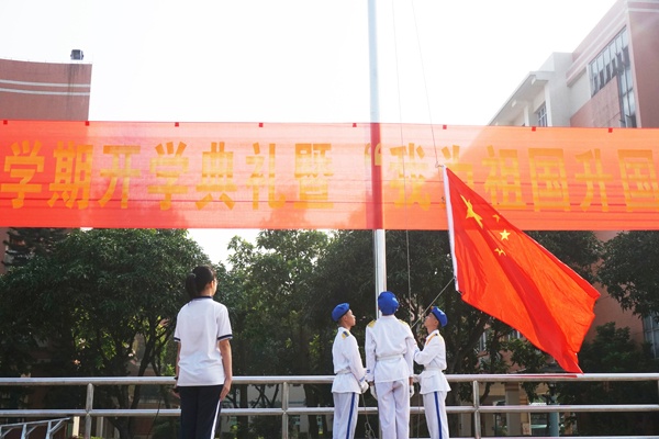 伴隨著莊嚴(yán)肅穆的升國旗儀式,開學(xué)典禮正式開始,鮮艷的五星紅旗迎著旭日,伴著晨風(fēng)飄揚。