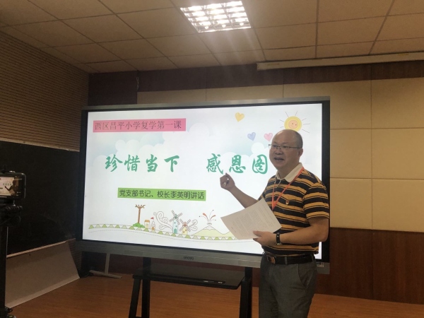 久違的教室,熟悉的老師和同學(xué),親切的上課鈴聲和孩子們臉上洋溢的興奮無處不在向大家展示著回校的欣喜。早上八點四十分,學(xué)校的復(fù)學(xué)禮在莊嚴(yán)的升旗儀式中拉開帷幕。為了讓1-3年級的孩子們也能提前做好回校準(zhǔn)備,本次復(fù)學(xué)禮采用線上線下同步進(jìn)行。復(fù)學(xué)禮有市優(yōu)秀少先隊員蔡佳殷分享居家線上學(xué)習(xí)的感受,有各班家長代表對同學(xué)們的寄語,當(dāng)然還有學(xué)校校長李英明的復(fù)學(xué)第一講《珍惜當(dāng)下,感恩圖報》,他與全體師生一起回顧了疫情之下全國上下的努力,為順利開學(xué),昌平小學(xué)所有教職員工的辛勤付出,號召同學(xué)們要珍惜當(dāng)下,知恩圖報,他向同學(xué)們提出五點期望:一要按照學(xué)校要求、老師指導(dǎo),主動配合做好防疫細(xì)節(jié);二要把防控疫情知識作為本學(xué)期重要的學(xué)習(xí)內(nèi)容;三要保持好心情,疫情可怕,防控不可怕;四要思不足、找方法、補回來!相信自己,相信老師!五是希望四至六年級的大哥哥大姐姐做最好的自己,給一到三年級的弟弟妹妹樹立榜樣。
