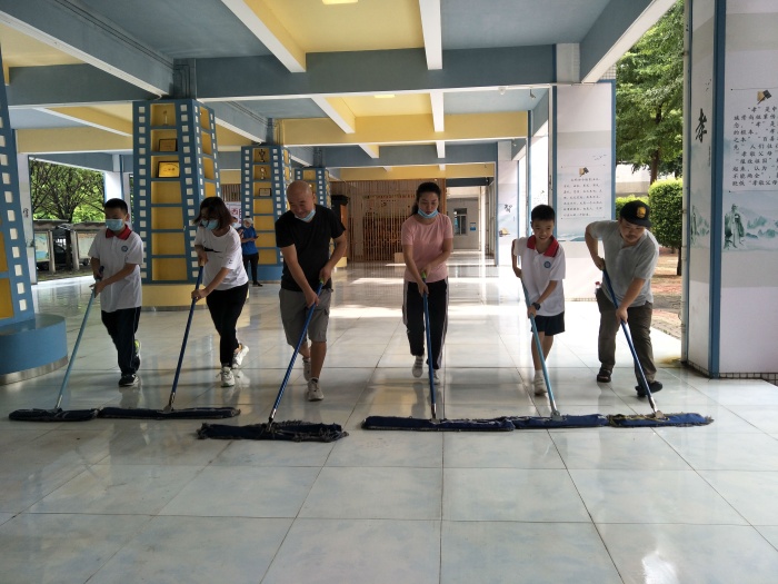 夏日炎炎,志愿者們齊心協(xié)力、熱火朝天,衣衫早已被汗水濕透,臉龐已被曬得通紅。經(jīng)過三小時的辛勤勞動,人行道、走廊、綠化帶、停車場、體育館、教學樓、辦公樓都被清理得干干凈凈。