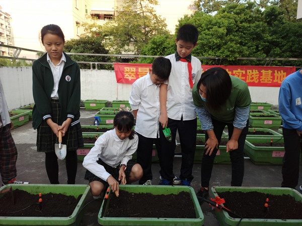 本次活動(dòng)的學(xué)校聯(lián)合了高段老師利用周一下午興趣小組的時(shí)間,選取四到六年級(jí)的部分同學(xué)在一樓階梯室和?!伴_(kāi)心農(nóng)場(chǎng)”中開(kāi)展活動(dòng)。在教室里,學(xué)生們通過(guò)講解、視頻等形式了解了土壤和植物生長(zhǎng)的必備條件,了解了“厚土堆肥”的新型農(nóng)業(yè)的種植理念。