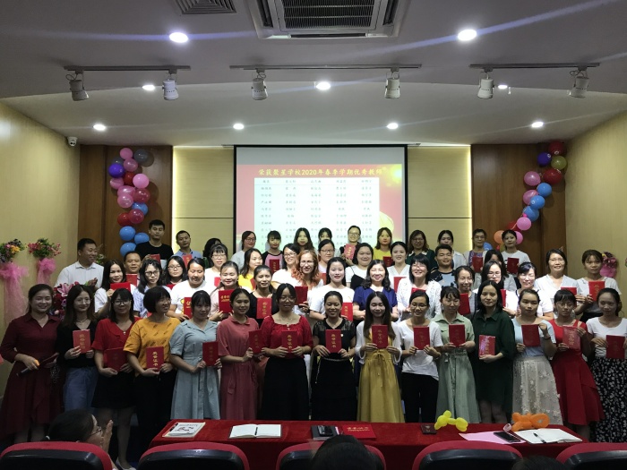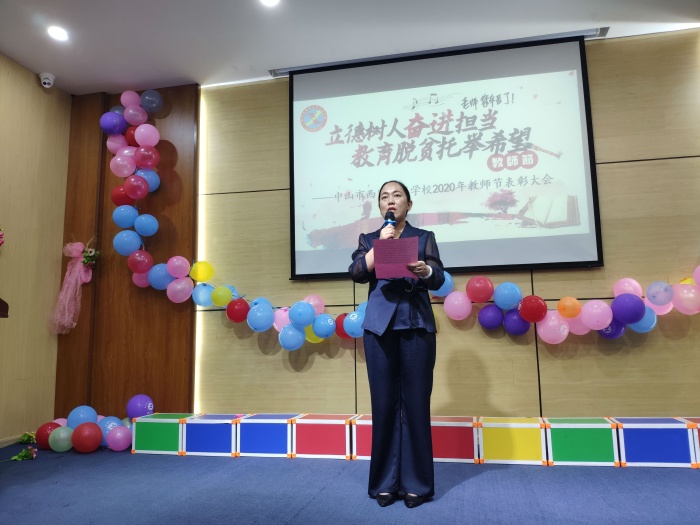 夜幕時(shí)分,華燈初上,聚星學(xué)校階梯室,處處洋溢著節(jié)日的氣氛。由七年級(jí)3班鐘欣怡同學(xué)和劉銦子老師主持的教師節(jié)表彰大會(huì)如期舉行。孩子們通過(guò)“演唱、詩(shī)歌朗誦、手語(yǔ)操表演、合唱”等形式,向老師們表達(dá)最真摯的謝意。路海云校長(zhǎng)致辭,對(duì)辛勤工作的老師表達(dá)了真誠(chéng)的問(wèn)候和深深的祝福,勉勵(lì)老師們做新時(shí)代的四有教師,繼續(xù)全力以赴,再創(chuàng)佳績(jī)。會(huì)上,對(duì)2019--2020學(xué)年聚星學(xué)校榮獲市區(qū)優(yōu)秀的先進(jìn)個(gè)人,聚星學(xué)校優(yōu)秀科組、優(yōu)秀教師、優(yōu)秀班主任進(jìn)行了表彰。