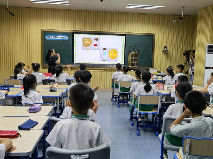 第一節(jié)課例是由西區(qū)煙洲小學(xué)羅婷婷老師進(jìn)行一年級課例《體驗不同的小崗位》課堂展示,羅老師先是通過小游戲讓學(xué)生了解自己的本領(lǐng);接著播放情景視頻,了解社區(qū)服務(wù)中心、小崗位設(shè)置及公益幣,讓學(xué)生根據(jù)自身本領(lǐng)選擇合適的崗位;然后學(xué)生親身體驗“新聞播報員”“點(diǎn)心分發(fā)員”“藝術(shù)小星星”等小崗位,讓學(xué)生在體驗中認(rèn)識到勝任這些崗位要做到具備本領(lǐng)、做好準(zhǔn)備、認(rèn)真細(xì)致的要求。同時在課堂中也滲透財經(jīng)素養(yǎng)教育,讓學(xué)生體驗收益。最后進(jìn)行拓展延伸,讓學(xué)生了解生活中的工作崗位,初步接觸人生規(guī)劃。