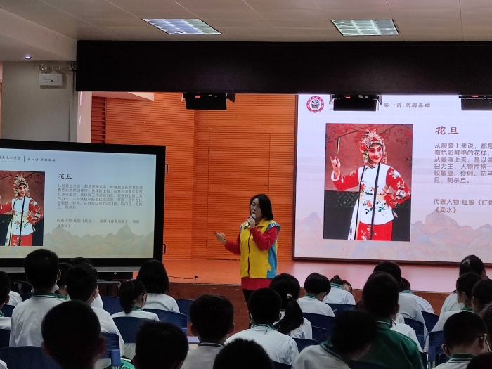 首先,由梁艷婷老師為學(xué)生們進(jìn)行了京劇知識(shí)普及講座,讓學(xué)生們初步了解京劇的形成與影響、京劇表演的特點(diǎn)等戲曲知識(shí),為同學(xué)們普及了京劇四大行當(dāng)——“生、旦、凈、丑”等京劇知識(shí)。梁老師還與同學(xué)們展開了有趣的互動(dòng),以加深同學(xué)們對(duì)京劇這一劇種的理解,也讓同學(xué)們深刻體會(huì)到了京劇演員“臺(tái)上三分鐘,臺(tái)下十年功”的刻苦精神。