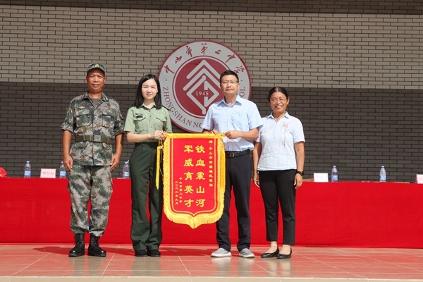 同學(xué)們?nèi)〉玫臉s譽離不開教官的引領(lǐng)和付出,學(xué)校為優(yōu)秀教官們頒獎。“鐵血震山河,軍威育英才”,為表示對教官的感謝,吳祥明校長、梁紅妹副校長向承訓(xùn)方贈送錦旗。
