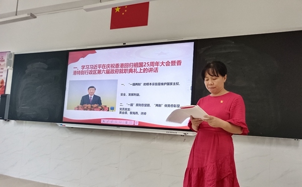首先由部組織委員馬興蘭同志帶領(lǐng)全體黨員一起學(xué)習(xí)了《習(xí)近平在慶祝香港回歸祖國25周年大會暨香港特別行政區(qū)第六屆政府就職典禮上的講話》,主要內(nèi)容有:“一國兩制”的根本宗旨是維護(hù)國家主權(quán)、安全、發(fā)展利益;“一國”原則愈堅固,“兩制”優(yōu)勢愈彰顯。黃全順、黎海燕、許婷等同志作為黨員代表紛紛表態(tài):“一國兩制”是創(chuàng)舉,是具有強(qiáng)大的生命力,是確保香港長期繁榮穩(wěn)定、維護(hù)香港同胞福祉的好制度。