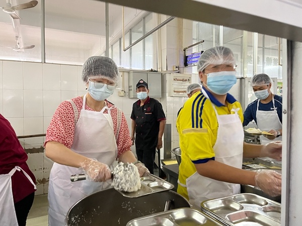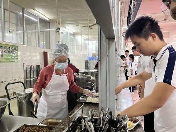在校長的帶頭示范和唐磊組長的號召下,老師們紛紛報名參與,不一會兒就馬上滿員。細化分工,崗前培訓,注意事項等,唐磊組長每天都重復著去培訓支援食堂的教職工。因此,在每個飯點來臨前,都會有這樣一道風景:一支由教職工組成的小隊伍走進食堂協(xié)助。一種無形中的默契形成了,教職工與飯?zhí)脝T工相互配合,大大縮短了學生等候的時間,也確保了熱乎乎的飯菜能夠更快地在這個冬日里送到學生的手里。