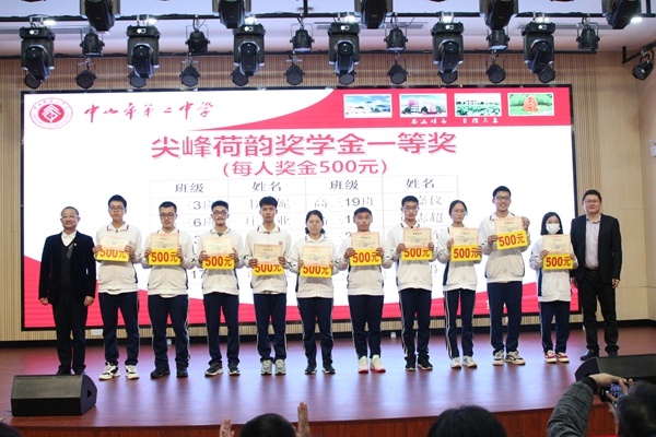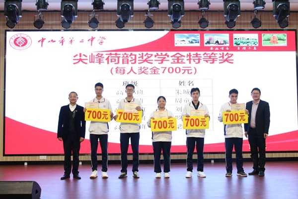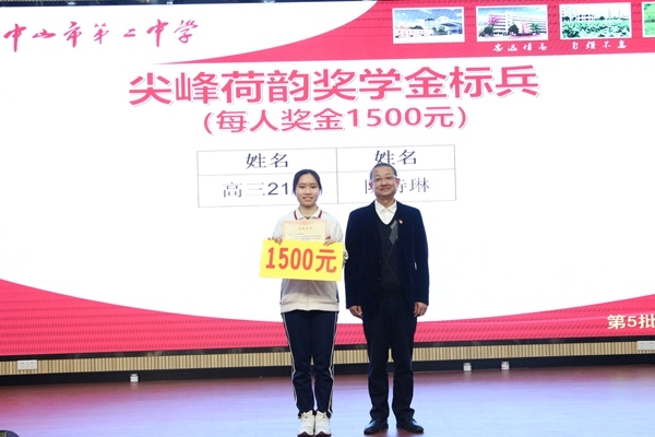 梁學(xué)斌副校長宣讀中山市第二中學(xué)表彰決定,對(duì)獲得尖峰荷韻獎(jiǎng)學(xué)金標(biāo)兵獎(jiǎng)、特等獎(jiǎng)、一等獎(jiǎng)、二等獎(jiǎng)、三等獎(jiǎng)獎(jiǎng)學(xué)金的學(xué)生,以及獲得“文明班級(jí)”“三好學(xué)生標(biāo)兵””星級(jí)學(xué)習(xí)型家長”榮譽(yù)稱號(hào)的集體和個(gè)人進(jìn)行表彰頒獎(jiǎng),號(hào)召全校同學(xué)向身邊的榜樣學(xué)習(xí),奮發(fā)圖強(qiáng),爭取優(yōu)異成績。獲獎(jiǎng)同學(xué)依批次上臺(tái)領(lǐng)獎(jiǎng)。