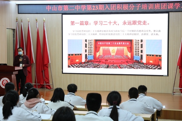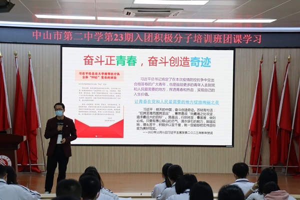 2023年1月6日晚,中山市第二中學(xué)第23期入團(tuán)積極分子培訓(xùn)班在中山市第二中學(xué)階梯室正式開(kāi)班,并由校黨委委員、德育處主任李燦澤老師開(kāi)講主題團(tuán)課第一課。