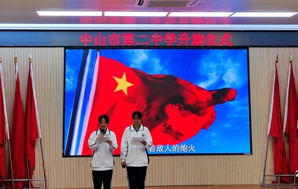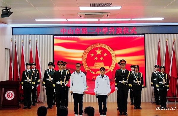 3月27日清晨,中山二中于階梯室開展本周升旗儀式,國旗班同學(xué)手持國旗,列隊進場。鮮紅的國旗,伴隨著雄壯的國歌聲,升旗儀式莊嚴而神圣。高一6班兩位同學(xué)作《藝術(shù)節(jié)來啦》的國旗下演講。