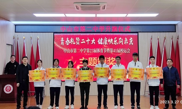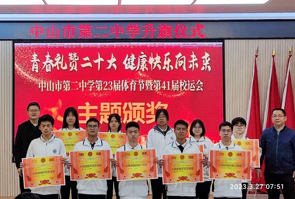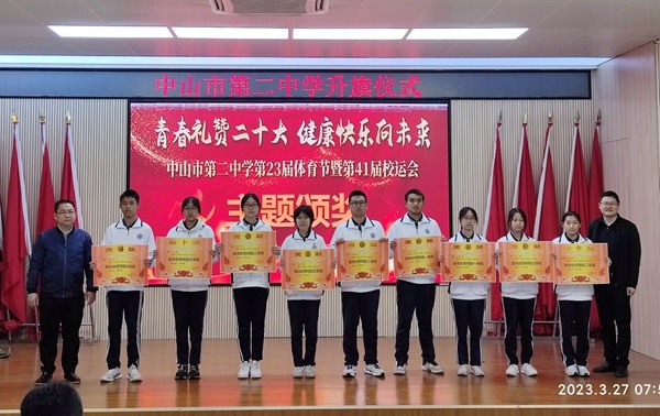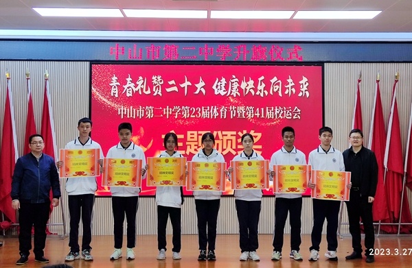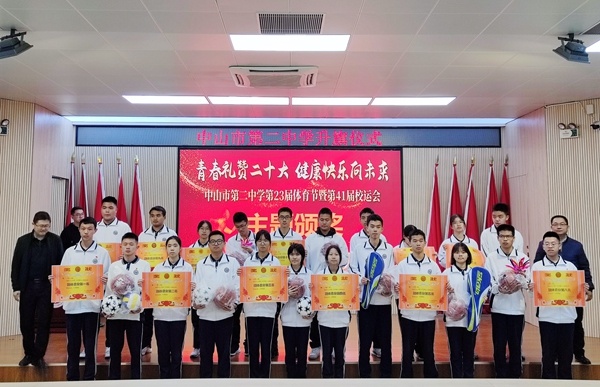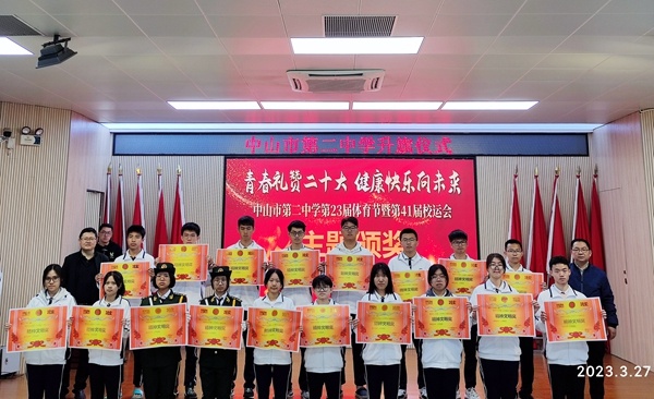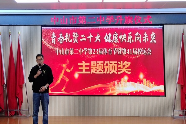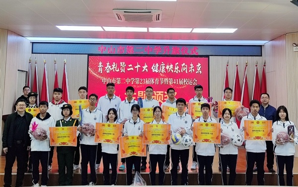 演講結(jié)束后,體育科組吳斌老師主持第41屆校運動會頒獎。在老師和同學(xué)們的共同努力下,中山市第二中學(xué)第41屆校運動會圓滿的落下帷幕,本次運動會充分的體現(xiàn)了各班級團結(jié)一心,共同拼搏的可貴精神。吳斌老師主持對本屆運動會獲得各項集體獎的班級進行了頒獎典禮。獎項分別有運動會入場式獲獎班級、運動會獲得宣傳優(yōu)秀班級、運動會獲得精神文明班級獎、運動會團體總分獲獎班級。在本次運動會上全體運動員努力拼搏,積極進取,賽出了風(fēng)格,賽出了水平,創(chuàng)造出許多優(yōu)異的成績,展現(xiàn)了更快、更高、更強的奧林匹克精神。
