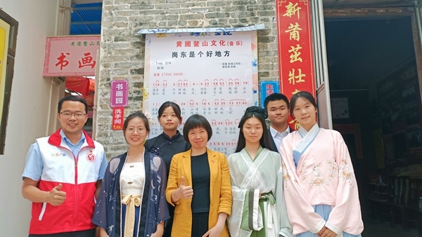 首先,潘添元老師帶領(lǐng)我們參觀了百年書屋,有文化廊、讀書樂園、詩聯(lián)樓、書香苑、書畫園和生活花地。他向我們介紹了百年書屋的建設(shè)歷史,并分享自己的人生故事,潘老師87歲高齡,但精神矍鑠,和藹可親。接著,黃圃鎮(zhèn)關(guān)工委常務(wù)副主任譚鏡煒向我們講解了鰲山村的悠久歷史,并分享了他和百年書屋主人的交往故事,即興給我們朗誦了潘添元老師的代表詩作和他自己的詩作,聲情并茂,深深吸引了在場的師生。他帶領(lǐng)師生一起吟唱《黃圃贊歌》,將整個分享環(huán)節(jié)推到高潮,最后他還采用讓學(xué)生搶答的形式贈送黃圃明信片。 讀書分享展示環(huán)節(jié)在書畫園進行,由二中五名學(xué)生志愿者和劉禮娜老師分享四大名著。