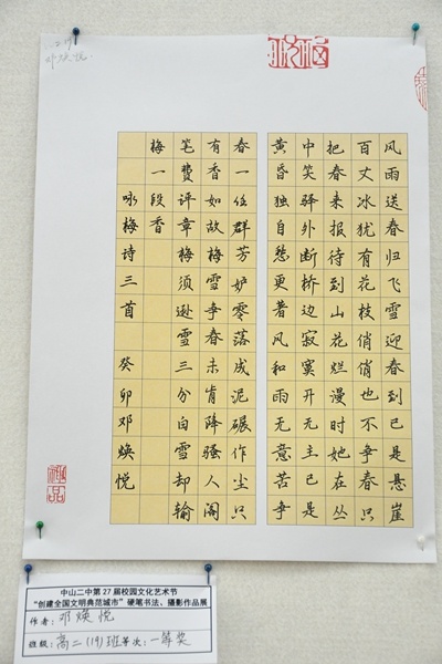 隨著學(xué)校擴改建工程順利完成,教書育人環(huán)境持續(xù)優(yōu)化,中山二中美術(shù)科組老師力求讓新美術(shù)館發(fā)揮展示與交流、教育與傳播的功能,努力提高學(xué)生的審美水平和學(xué)校認同感。在這個萬物復(fù)蘇、春暖花開的季節(jié),我們迎來了中山市第二中學(xué)第27屆校園文化藝術(shù)節(jié)攝影、硬筆書法作品展覽。