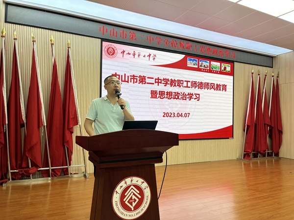 為深入學(xué)習(xí)貫徹習(xí)近平總書記重要講話精神,進(jìn)一步加強(qiáng)師德師風(fēng)建設(shè),打造黨和人民滿意的“四有”好教師。4月7日下午,中山市第二中學(xué)在階梯室召開師德師風(fēng)教育暨思想政治學(xué)習(xí)會,會議由黨委副書記梁紅妹同志主持,中山二中全校教職工參會。