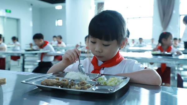 中午的食堂飯菜飄香,學生們排著整齊的隊伍有序來到食堂,測體溫、洗手、領取餐盤,安靜有序地享用美味的午餐?! ?/p>