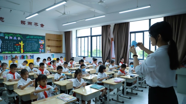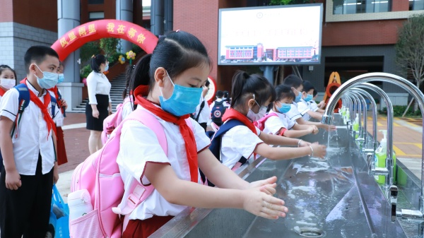 學校行政和值日老師早早在校門口等候,學生們抑制不住激動的心情,歡快地走下校車,興奮地向老師問好,并在值日老師的指揮下保持安全距離排好隊,依次進行體溫檢測、洗凈雙手,井然有序地走進想念已久的教室。