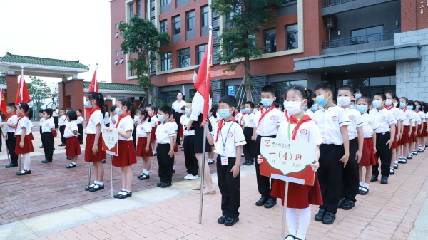 升旗啦!學生們神采奕奕,站姿挺拔,如同一個個小軍人。莊嚴的國歌聲中,國旗緩緩上升,迎風飄揚。