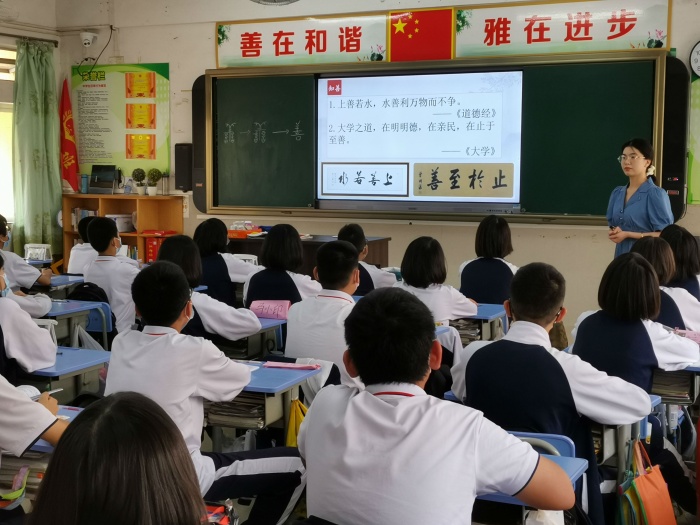 督導(dǎo)組專(zhuān)家首先聽(tīng)了張藝?yán)蠋焾?zhí)教的《善》一課。張老師首先從學(xué)校善雅文化建設(shè)及“善”字的漢字字形演變過(guò)程導(dǎo)入,再引導(dǎo)學(xué)生誦讀《道德經(jīng)》《大學(xué)》里的語(yǔ)句,感受傳統(tǒng)文化語(yǔ)言的魅力、體驗(yàn)傳統(tǒng)文化精神;通過(guò)“知善”“論善”“行善”三個(gè)活動(dòng)環(huán)節(jié),讓學(xué)生對(duì)中華傳統(tǒng)文化中的“善”進(jìn)行深入地感知、浸潤(rùn)、體驗(yàn)。濃濃的傳統(tǒng)文化氛圍、活潑的教學(xué)形式,得到了督導(dǎo)組專(zhuān)家的贊揚(yáng)。