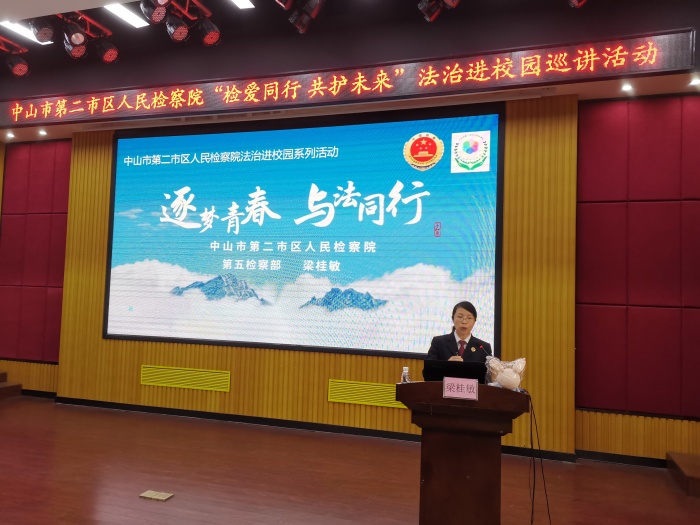 為進(jìn)一步提高學(xué)生法治意識(shí),增強(qiáng)學(xué)生法治素養(yǎng),提升學(xué)生自我保護(hù)能力,2023年2月15日,東鳳中學(xué)在報(bào)告廳開展中山市第二市區(qū)人民檢察院“檢愛同行 共護(hù)未來”法治進(jìn)校園巡講活動(dòng)。中山市第二市區(qū)人民檢察院主任、東鳳中學(xué)法制副校長梁桂敏,東鳳鎮(zhèn)教育和體育事務(wù)中心楊志向老師,東鳳中學(xué)溫永誼副校長以及學(xué)生代表220多人參加本次活動(dòng),本次活動(dòng)由溫永誼副校長主持。