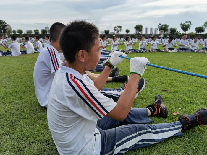 接下來進行的是信任動力繩。這個游戲要求所有人手握繩圍成圈,雙腳合并,用腳后跟著地,同時向后倒。一個同學(xué)在繩子上走,另外兩個同學(xué)分別在內(nèi)圈和外圈保護走繩子的同學(xué),走的過程中不能掉下來,否則要重新開始,十分鐘內(nèi)走完繩子人數(shù)最多的班級勝出。比賽伊始,同學(xué)們互相嬉鬧,但很快就有同學(xué)提出要相互團結(jié),相互協(xié)助方能成功。在大家的齊心協(xié)力下,同學(xué)們都能順利地繞繩子走完一圈。整個過程中,同學(xué)們的笑聲和鼓勵聲回蕩在足球場上,每個人都在充分享受比賽帶來的興奮和快樂,把平時學(xué)習(xí)生活中的煩惱和壓力都徹底釋放了出來。