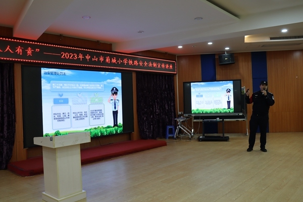 活動(dòng)現(xiàn)場(chǎng),陳家豪警官通過(guò)列舉具體事例向菊城小學(xué)的學(xué)生代表進(jìn)行了安全宣傳教育,講解鐵路安全知識(shí)。通過(guò)觀看宣傳動(dòng)畫(huà)片、問(wèn)題互動(dòng)等方式,讓同學(xué)們?cè)敿?xì)了解擅自進(jìn)入鐵路防護(hù)網(wǎng)、在鐵路上放異物、向火車(chē)投擲石塊、在鐵路上放無(wú)人機(jī)和孔明燈等違法行為對(duì)鐵路安全的危害以及要承擔(dān)的違法后果。最后,重點(diǎn)圍繞《中華人民共和國(guó)治安管理處罰法》《中華人民共和國(guó)刑法》等法律法規(guī)中涉及鐵路安全的規(guī)定,宣傳鐵路安全常識(shí)和鐵路護(hù)路工作的目的和意義,倡導(dǎo)同學(xué)們愛(ài)護(hù)鐵路、安全出行,不攀爬、不損壞鐵路設(shè)施,自覺(jué)遵守法律法規(guī)。