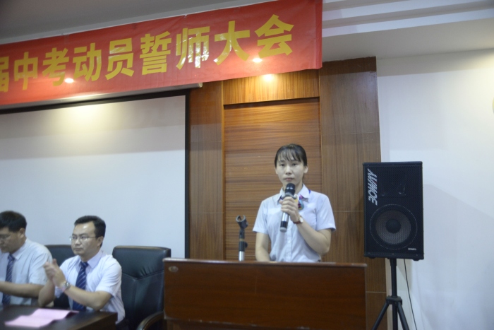 全體初三學(xué)子伴隨著激昂的旋律陸續(xù)入場,誓師大會在莊嚴(yán)的國歌聲中拉開序幕。初三教師代表陳園老師率先發(fā)言,她諄諄教誨,對全體學(xué)生在提出了詳細(xì)的要求,要求同學(xué)們樹立必勝的信心,制定學(xué)習(xí)計劃,珍惜時間,調(diào)整心態(tài),以堅強(qiáng)的意志迎戰(zhàn)中考。