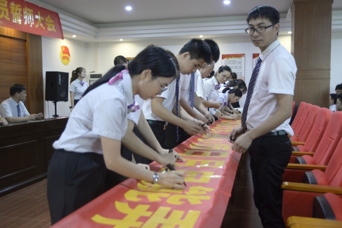之后,初三年級組長王景付老師帶領(lǐng)全體初三教師發(fā)出了錚錚誓言:定會做學(xué)生強(qiáng)有力的后盾,與學(xué)生同甘共苦,為德恒學(xué)子保駕護(hù)航。緊隨其后,全體初三學(xué)生也莊嚴(yán)宣誓:目標(biāo)明確,積極向上;勤學(xué)苦練,斗志昂揚;講究方法,保質(zhì)保量;頑強(qiáng)拼搏,不棄不放;爭分奪秒,適度緊張;全力以赴,創(chuàng)造輝煌!鏗鏘的誓言如春雷陣陣響徹云霄,燃起了孩子們的斗志,堅定了他們必勝的信心。最后,全體師生在橫幅上中簽名以表決心。至此,本次誓師大會圓滿結(jié)束。
