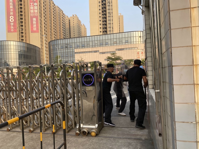 一名由教師扮演的“暴恐分子”企圖騙過(guò)門衛(wèi)進(jìn)入校園,被值班保安識(shí)破,馬上將其阻止在校門外。隨后,“暴恐分子”翻過(guò)欄桿,伺機(jī)沖進(jìn)校園,兩名門衛(wèi)保安立即向前阻止,立即啟動(dòng)學(xué)校防恐防暴應(yīng)急預(yù)案,當(dāng)值保安與“暴恐分子”周旋、搏斗,最終成功將“暴恐分子”制服,交由及時(shí)趕到的派出所警員進(jìn)行處置。