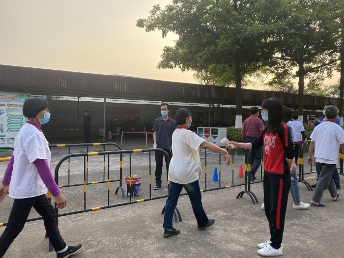 演練正式開(kāi)始,各個(gè)演練項(xiàng)目人員佩戴口罩,各就各位,各司其職。學(xué)校老師扮演的“家長(zhǎng)”在家長(zhǎng)等待區(qū)聚集,學(xué)校老師進(jìn)行疏散。接著,“學(xué)生們”陸續(xù)來(lái)到了學(xué)校門口,排隊(duì)等候測(cè)溫。體溫檢測(cè)老師檢查學(xué)生是否佩戴口罩,并保證人與人之間間隔1米,對(duì)學(xué)生逐一進(jìn)行體溫監(jiān)測(cè),體溫正常者登記后依次進(jìn)入校園。