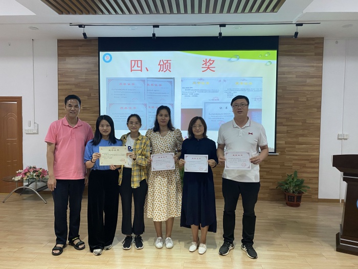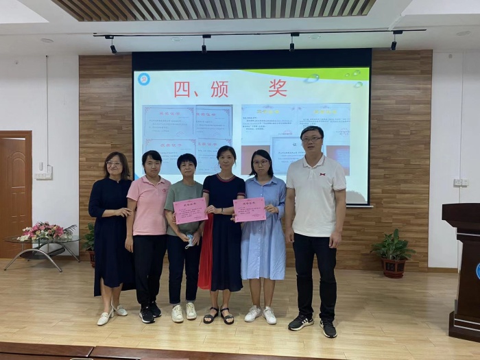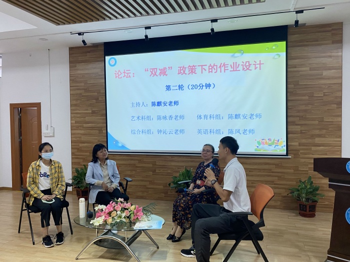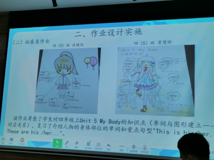 第二組上場的是由任教英語的陳鳳老師和任教術(shù)科的陳麒安、陳泳香和鐘沁云等3位老師。陳鳳老師圍繞“減量不減質(zhì)”的旨意,從基礎(chǔ)類、拓展類和探究類等方面來分享個人和科組老師的做法,如:看圖選序號,改變以往沉悶的抄寫單詞的方式,讓學生在積極動腦中把單詞歸類書寫。又如:學生制做水果拼盤后說水果或動物單詞,學完身體部位單詞后讓學生畫圖寫句子或錄制聽說視頻,用所學的單詞、句子口頭描述自己的身體部位,或描述房子平面圖或進行繪本閱讀。她還談到寫句配圖、制作手抄小報、自制繪本等作業(yè)能發(fā)揮學生所長,讓學科間深度融合,促進學生多智能的發(fā)展。其它三位老師雖教術(shù)科,但根據(jù)學科特點,布置有針對性的作業(yè),如網(wǎng)上測評、跳繩打卡,或緊扣教材設(shè)計多樣的作業(yè),如:道德與法治課里的表格、視頻、愛心樹等等。代表發(fā)言的老師圖文并茂、準備充分、理論聯(lián)系實際,生動地為在場的老師展示作業(yè)設(shè)計方面的成果,讓每位老師學有所獲。
