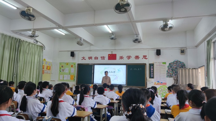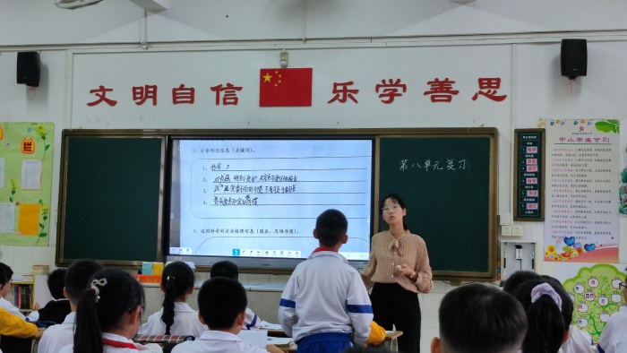 第二節(jié)走進(jìn)五(1)班。廖賢芬老師執(zhí)教第八單元的復(fù)習(xí)課。廖老師從字詞基礎(chǔ)復(fù)習(xí)和課文內(nèi)容復(fù)習(xí)兩大方面進(jìn)行授課。首先是字詞復(fù)習(xí)、檢測(cè),廖老師通過(guò)同桌互讀檢測(cè)、借助多媒體“拔河比賽”答題小游戲、完成加油任務(wù)單等多種形式,帶領(lǐng)學(xué)生進(jìn)行基礎(chǔ)字詞、易錯(cuò)字詞、多音字等基礎(chǔ)知識(shí)的復(fù)習(xí)鞏固。然后是課文內(nèi)容的復(fù)習(xí),廖老師通過(guò)引導(dǎo)學(xué)生讀單元導(dǎo)語(yǔ),引出該單元的主題,讓學(xué)生了解該單元的課文都是與書(shū)有關(guān),通過(guò)熟讀背誦、字詞理解練習(xí)等方式對(duì)單元中的課文進(jìn)行復(fù)習(xí)鞏固。最后帶領(lǐng)學(xué)生回顧梳理信息的方法,并帶領(lǐng)學(xué)生閱讀短文并完成梳理信息的小練習(xí),從而學(xué)以致用。