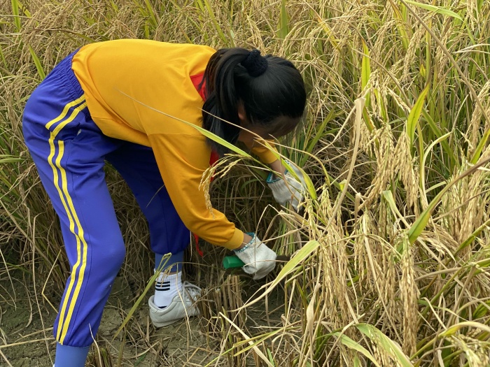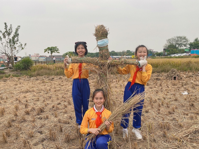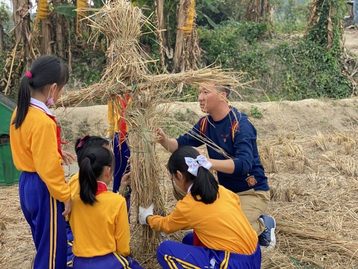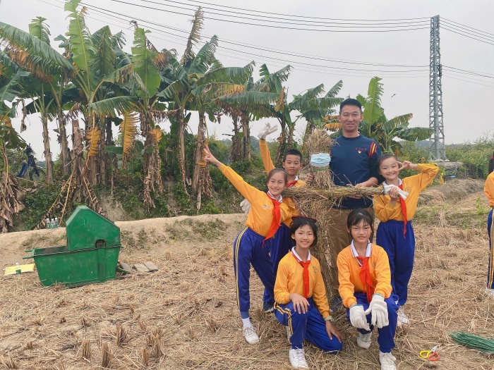 課程結(jié)束后,師生懷著期待興奮的心情共同前往“左步稻田”。隊(duì)員們五人一組,手握鐮刀,在現(xiàn)場(chǎng)農(nóng)民叔叔和老師的指導(dǎo)下走進(jìn)稻田,卷起小褲腳彎下腰,左手抓稻,右手握鐮刀,刀口向下斜,手起刀落,當(dāng)快樂(lè)小農(nóng)夫來(lái)一場(chǎng)豐收之旅。收割后,隊(duì)員們還在老師的指導(dǎo)下用打谷機(jī)進(jìn)行稻谷脫粒。同時(shí)現(xiàn)場(chǎng)還進(jìn)行了扎稻草人活動(dòng),隊(duì)員們沉浸在扎稻草人的歡樂(lè)中,不亦樂(lè)乎。