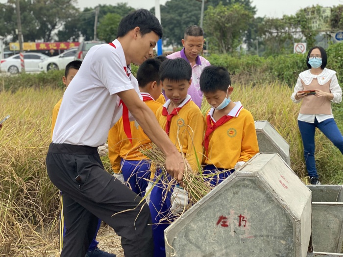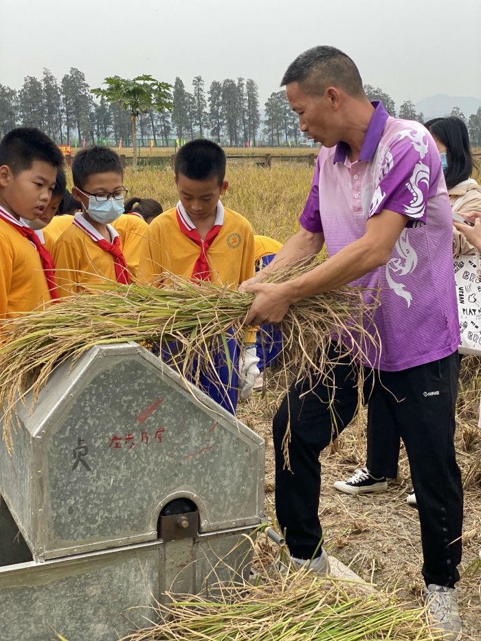 接著南朗街道左步村黨支部孔憲坤書(shū)記與梁建輝老師以及兩位隊(duì)員代表為勞動(dòng)教育基地揭牌。揭牌儀式后,參加活動(dòng)的30多名師生走進(jìn)左步人文歷史館,墻上的一幅幅照片生動(dòng)地訴說(shuō)著左步的悠久歷史以及革命烈士的英勇事跡。隊(duì)員們更加直觀地了解了左步的歷史和文化,接受了一次生動(dòng)而深刻的愛(ài)國(guó)主義和家國(guó)情懷教育,增強(qiáng)了“不忘初心、牢記使命,永遠(yuǎn)熱愛(ài)黨,永遠(yuǎn)跟黨走”的堅(jiān)定信念。隨后由南朗小學(xué)大隊(duì)輔導(dǎo)員林舒敏老師和陳麒安老師為隊(duì)員們帶來(lái)一節(jié)生動(dòng)有趣的勞動(dòng)課程學(xué)習(xí)活動(dòng)。林舒敏老師為孩子們講述了稻谷的生長(zhǎng)過(guò)程、收割知識(shí),讓隊(duì)員們深刻領(lǐng)悟“誰(shuí)知盤(pán)中餐,粒粒皆辛苦”的意義,促使隊(duì)員們懂得收獲不易,學(xué)會(huì)珍惜與感恩。陳麒安老師則現(xiàn)場(chǎng)演示如何割稻谷,以及注意事項(xiàng)。隊(duì)員們專(zhuān)心致志地聽(tīng)講,大有所獲。