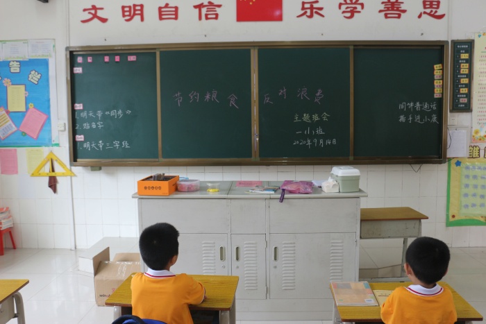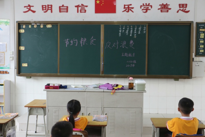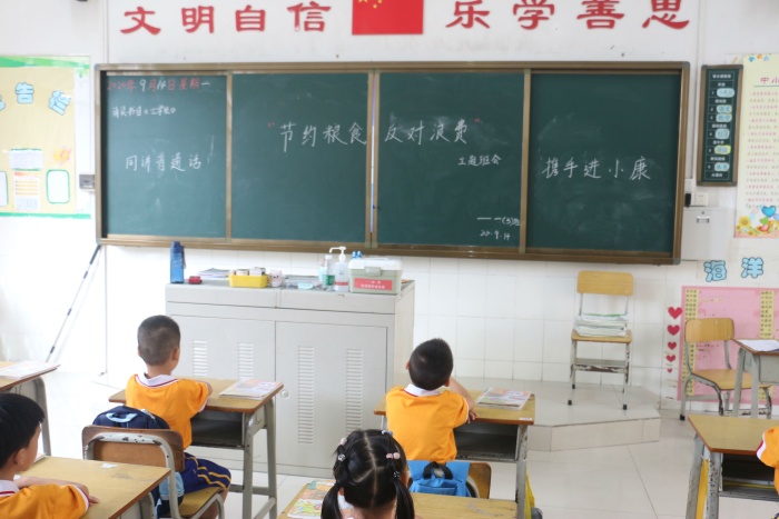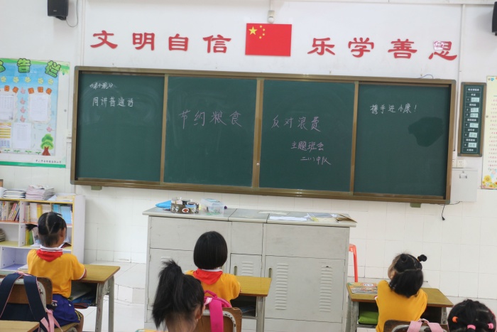 為了弘揚中華民族勤儉節(jié)約的傳統(tǒng)美德,引導(dǎo)學(xué)生樹立節(jié)約觀念。9月14日,南朗小學(xué)組織一、二、三年級開展了“節(jié)約糧食,反對浪費”主題班會。各班班主任紛紛在黑板上寫上“節(jié)約糧食,反對浪費”的主題詞。