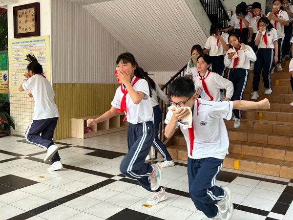 同學們聽從指揮迅速排成兩條縱隊,由班主任及科任老師沿疏散標志從就近安全出口撤離,大家用小毛巾捂住口鼻,彎著身體、快速有序地按照既定的逃生路線,撤離到學校運動場,從警報聲響起到最后一名學生撤離到廣場,共用時3分鐘。學生安全撤離到運動場后,各班迅速清點人數(shù),確保每一名學生都已安全撤離,并及時將清點結果匯報給指揮員。