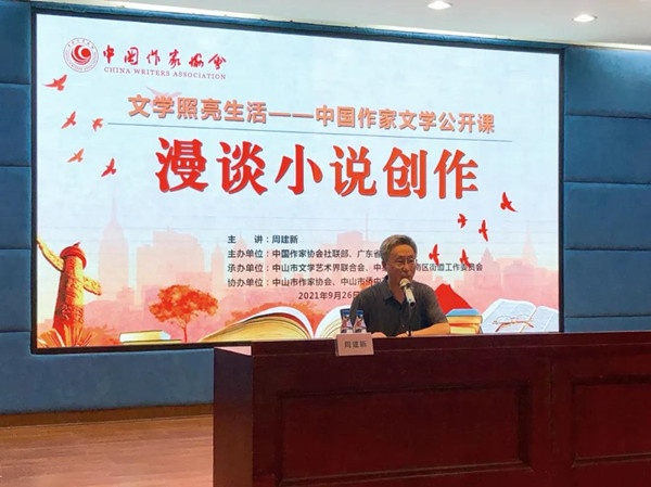 9月26日下午,由中國作家協(xié)會社聯(lián)部,廣東省作家協(xié)會主辦,中山市文學(xué)藝術(shù)界聯(lián)合會、中共中山市南區(qū)街道工作委員會承辦,中山市作家協(xié)會、中山市僑中英才學(xué)校協(xié)辦的“文學(xué)照亮生活——中國作家文學(xué)公開課”走進(jìn)廣東省中山市,在僑中英才學(xué)校一樓多功能廳正式開講。全國少數(shù)民族文學(xué)創(chuàng)作駿馬獎獲得者、遼寧省作協(xié)副主席周建新以“漫談小說創(chuàng)作”為主題進(jìn)行講授,帶給中山文學(xué)愛好者一場文學(xué)盛宴。