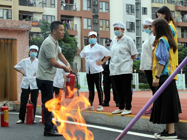 演練結(jié)束后,黃強助理為學校重點崗位人員、新入職教職工進行滅火器、室內(nèi)消防栓操作培訓。黃助理現(xiàn)場講解消防器材的構(gòu)造、使用方法和注意事項,并現(xiàn)場示范滅火器實操知識技能,教職人員現(xiàn)場模仿演練,動手操作、親身體驗,在遇到火災時能夠正確使用消防器材。