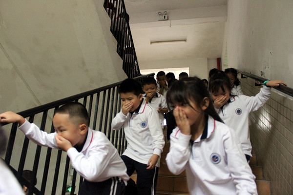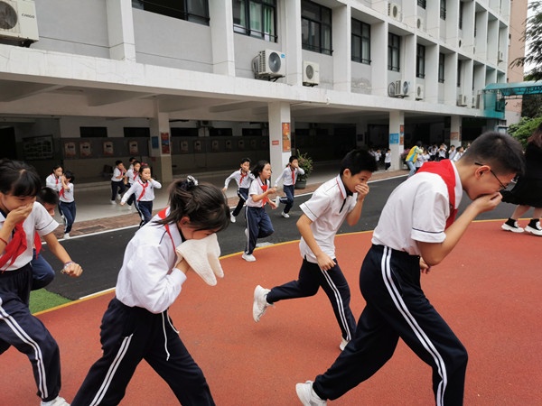 當日下午,隨著警報聲響起,全體師生“火”速行動!同學們聽從指揮迅速排成兩條縱隊,由班主任及科任老師沿疏散標志從就近安全出口撤離,大家用手捂住口鼻,彎著身體、快速有序地按照既定的逃生路線,撤離到學校運動場,從警報聲響起到最后一名學生撤離到廣場,共用時2分57秒。學生安全撤離到運動場后,各班迅速清點人數(shù),確保每一名學生都已安全撤離,并及時將清點結(jié)果匯報給指揮員。