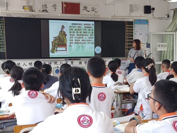 本次教研活動(dòng)第一環(huán)節(jié)是跟崗老師上課,首先是跟崗教師張海波執(zhí)教的初一語(yǔ)文《駱駝祥子》。張老師立足教材,以祥子的悲劇探因?yàn)橹黝},通過給每個(gè)章節(jié)取小標(biāo)題的形式帶著學(xué)生再次重溫故事情節(jié)。在此環(huán)節(jié)中,張老師特別設(shè)置了有關(guān)祥子“三起三落”的情節(jié),讓同學(xué)們梳理概括。同學(xué)們?cè)谑煜で楣?jié)之后,張老師聚焦祥子的“三落”,引導(dǎo)學(xué)生對(duì)關(guān)鍵語(yǔ)句、段落進(jìn)行批注,在此基礎(chǔ)上,帶領(lǐng)學(xué)生細(xì)細(xì)琢磨祥子的心理變化,分析祥子悲劇的社會(huì)原因和個(gè)人原因。緊接著是跟崗教師余德芬,她執(zhí)教的是初一語(yǔ)文《賣油翁》。余老師首先范讀課文,糾正字音,然后帶著全班學(xué)生齊讀課文,讀出節(jié)奏。接下來,余老師結(jié)合學(xué)案疏通本文文意,重點(diǎn)關(guān)注課文中的實(shí)詞和虛詞教學(xué),并帶領(lǐng)學(xué)生著眼于課文中的兩個(gè)人物形象,借助學(xué)案分析人物形象的刻畫和特點(diǎn)。最后,運(yùn)用分析人物形象的方法,課堂上進(jìn)行練筆。