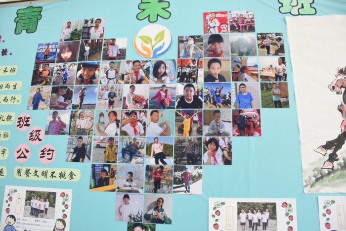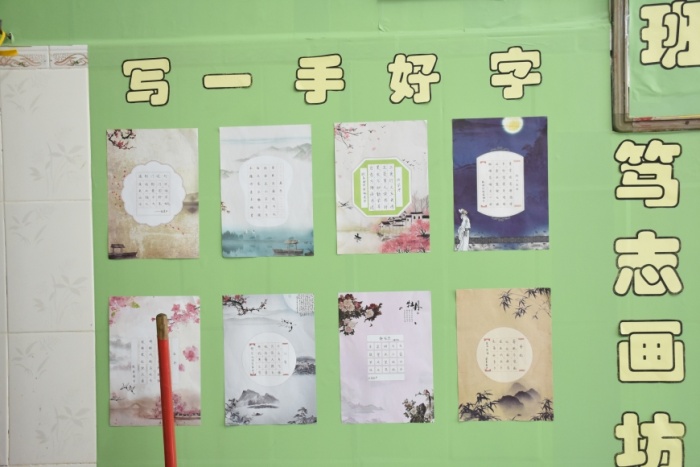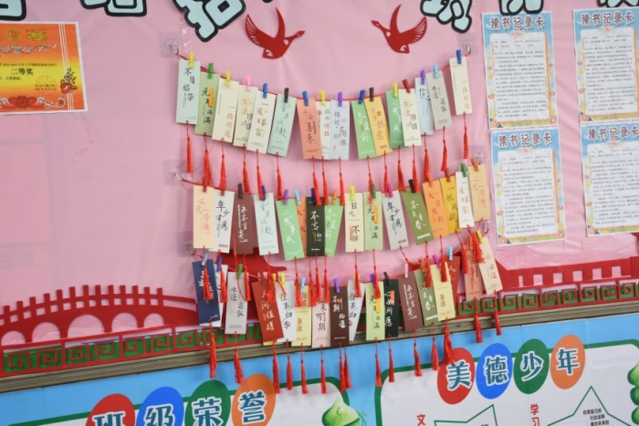 3.各班班主任還非常注重教室文化建設(shè),充分利用教室資源,力求每一面墻都會“說話”,讓每個角落都富有教育意義。每個班級發(fā)揮班主任及學(xué)生的智慧,精心設(shè)計、巧妙布置,力求教室和諧、高雅,具有濃厚的綠色、和諧,彰顯文明溫馨的文化氣息,有的教室的兩側(cè)墻壁上掛了不少名人名言,以時時規(guī)范孩子行為,處處讓孩子接受知識熏陶的同時,讓孩子們學(xué)會做事做人。教室的后面黑板有宣傳欄、班級公務(wù)欄等,主要用于張貼課程表、作息時間表、值日輪流表等。黑板報上的內(nèi)容根據(jù)不同注意和一些重要節(jié)日實(shí)時更新。不同的板塊都在記錄著孩子們成長的點(diǎn)滴,如美術(shù)、手抄版、書法等作品。有的板塊張貼著老師與孩子們的合照,下面書寫著班級的名稱、口號和座右銘,那是師生一起追求夢想的見證。也有班級創(chuàng)建了光榮榜,為了讓孩子們有一種健康的競爭意識,見賢思齊,并激發(fā)孩子們的學(xué)習(xí)熱情。