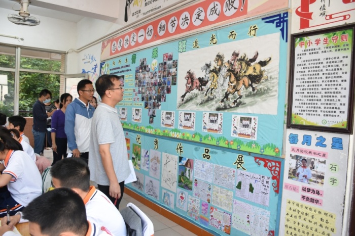 走進(jìn)每一間教室,評委老師都會被富有個性的布置所吸引。作品欄里也是碩果累累,有排布規(guī)整的手抄報作品,有行云流水的書法作品,還有五彩斑斕的繪畫作品,以及各班公示的小組特色組名、口號、組員介紹等等。