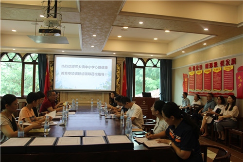 為進(jìn)一步了解和指導(dǎo)學(xué)校心理健康教育工作,有效防范心理危機(jī)事件,6月23日上午,三鄉(xiāng)鎮(zhèn)教工委副書記梁添帶,三鄉(xiāng)鎮(zhèn)團(tuán)委副書記、三鄉(xiāng)鎮(zhèn)少工委總輔導(dǎo)員林雪萍一行對(duì)中山市紀(jì)中三鑫雙語(yǔ)學(xué)校心理健康專項(xiàng)工作進(jìn)行調(diào)研。三鑫學(xué)??傂iL(zhǎng)沈偉忠、初中部副校長(zhǎng)兼初二年級(jí)校長(zhǎng)黃建軍以及各年級(jí)校長(zhǎng)等管理人員熱情接待調(diào)研組。調(diào)研組領(lǐng)導(dǎo)通過聽取匯報(bào)、推門聽課、查閱資料、實(shí)地察看場(chǎng)室、學(xué)生問卷等方式,對(duì)三鑫學(xué)校心理健康教育專項(xiàng)工作進(jìn)行了全方位的評(píng)估。