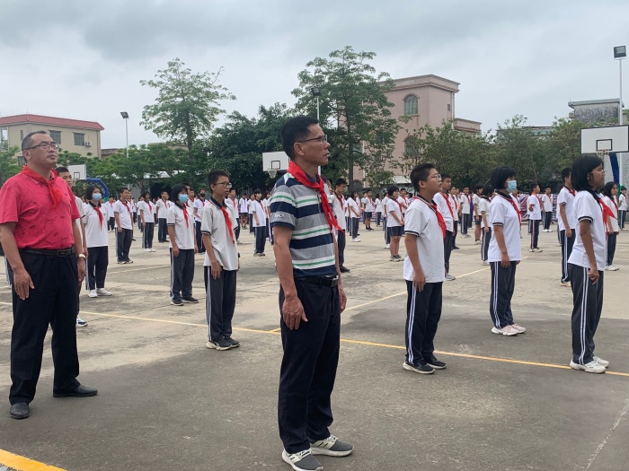 沙欄中學黨總支書記、校長、少工委主任梁炳華帶領(lǐng)全體少先隊員進行呼號:“準備著,為共產(chǎn)主義事業(yè)而奮斗!”“時刻準備著!”呼號結(jié)束,少先隊員們目送隊旗離場,隊旗的緩緩離場,標志著隊員們徹底告別童年時代,隊員們要滿懷希望,帶著勇氣和力量前行。