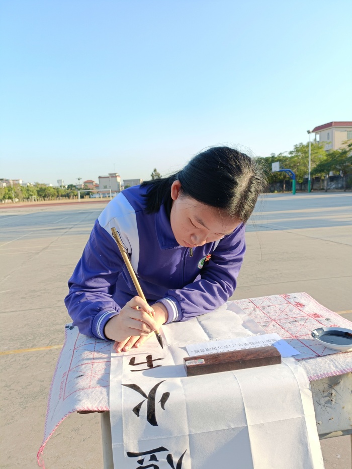 下午四點(diǎn),毛筆書法現(xiàn)場(chǎng)大賽在學(xué)校操場(chǎng)順利展開(kāi),參加毛筆書法大賽的學(xué)生共有四十多人,學(xué)校為參賽的選手提供了比賽用紙、用墨、碟子等用具,參賽者必須在40分鐘內(nèi)完成作品,不完整的作品不能參評(píng)。本次活動(dòng)策劃李常華、溫奕靈兩位老師首先向選手們發(fā)放了毛筆書法大賽的內(nèi)容,備選的共有6首古詩(shī),分別用簡(jiǎn)體和繁體印刷。主持人盧富生副主任介紹了活動(dòng)主題、比賽規(guī)則后,比賽正式開(kāi)始。選手們仔細(xì)思考,選材、折紙,全神貫注于作品的書寫中,一絲不茍,點(diǎn)橫撇捺,工整美觀,盡力表現(xiàn)出自己的最高水平,一張張紙上呈現(xiàn)出參賽學(xué)生的深厚書寫功底。同學(xué)們個(gè)個(gè)聚精會(huì)神,沉著冷靜,楷書、行書、篆書等筆畫有力,一個(gè)個(gè)清秀、工整的漢字充分展示了學(xué)生們良好的素質(zhì)和對(duì)傳統(tǒng)文化的熱愛(ài)。