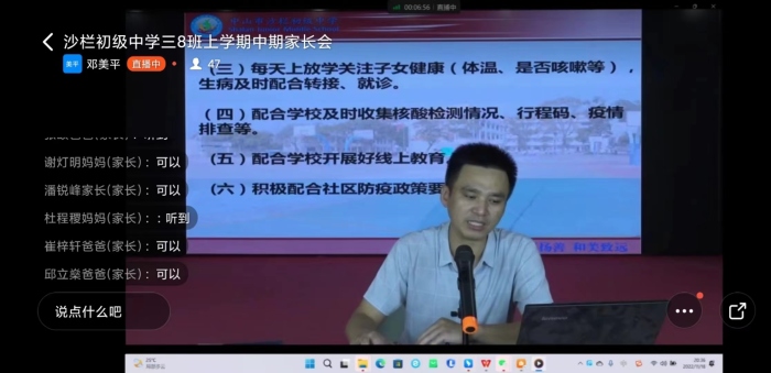 光陰似箭,日月如梭,轉(zhuǎn)眼間學(xué)期已過半。為了加強(qiáng)學(xué)校、教師與家長之間的聯(lián)系,增進(jìn)每一位家長對學(xué)校工作及孩子在校學(xué)習(xí)情況的了解,更好地達(dá)到家校攜手、共育孩子美好未來的目標(biāo),沙欄中學(xué)于2022年11月18日晚分級分班召開了線上家長會。